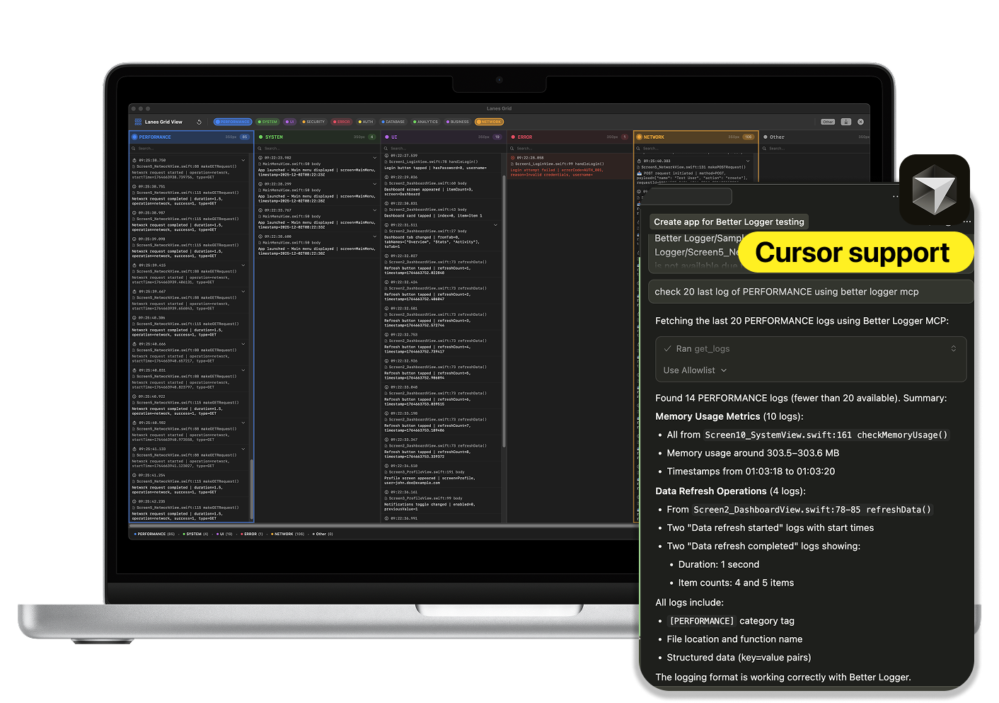 Better Logger runs embedded MCP server exposing log data and control functions through standardized protocol. When MCP-compatible IDE like Cursor connects to Better Logger’s MCP server, it gains programmatic access to live log streams, saved sessions, discovered lanes, and device information. AI assistants within these IDEs can query “what errors appeared in the last minute?”, “show me network-related logs”, or “explain this crash” with Better Logger providing contextual log data enabling AI to generate informed responses grounded in actual application behavior.
