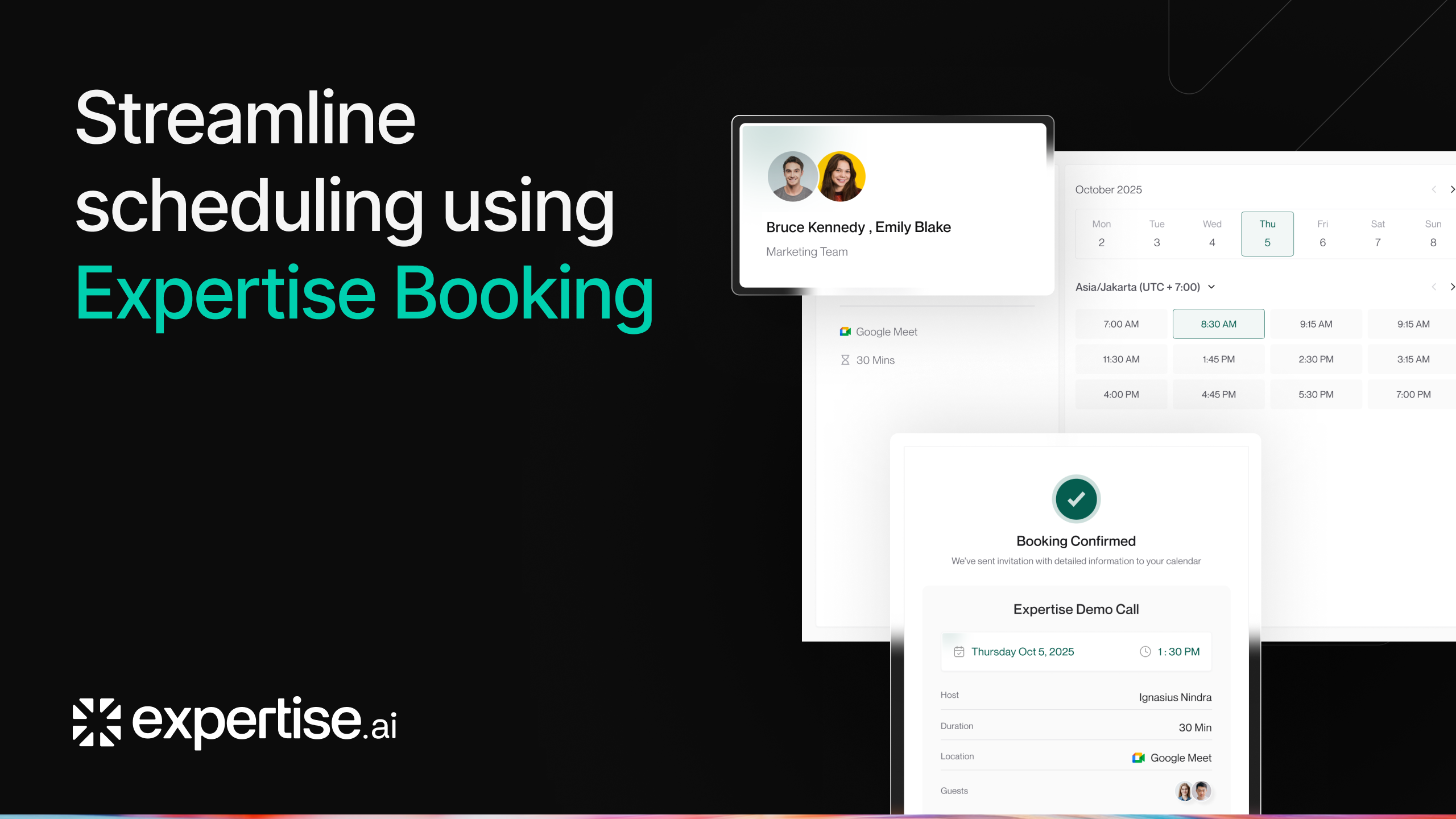 - AI enrichment creates competitive intelligence advantage: Unlike traditional schedulers that simply create calendar events, Expertise Booking automatically delivers prospect intelligence enabling strategic preparation and personalized outreach. Your team arrives at every meeting informed with actionable insights.