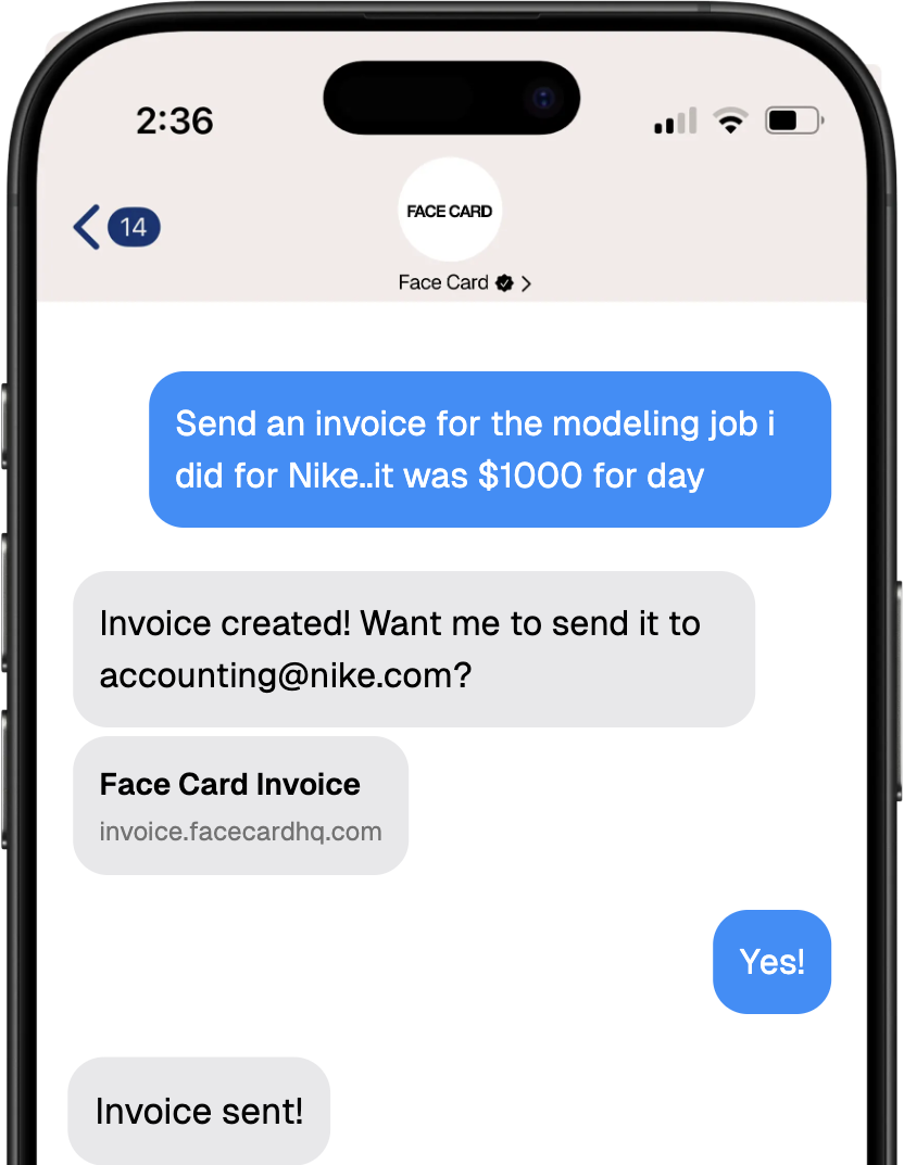- Conversational Invoice Generation: Create professional invoices through natural text conversations in iMessage or WhatsApp, where Face Card’s AI assistant guides you through the process by asking relevant questions about client details, services provided, rates, and payment terms. This eliminates the need for complex software interfaces or manual form completion.