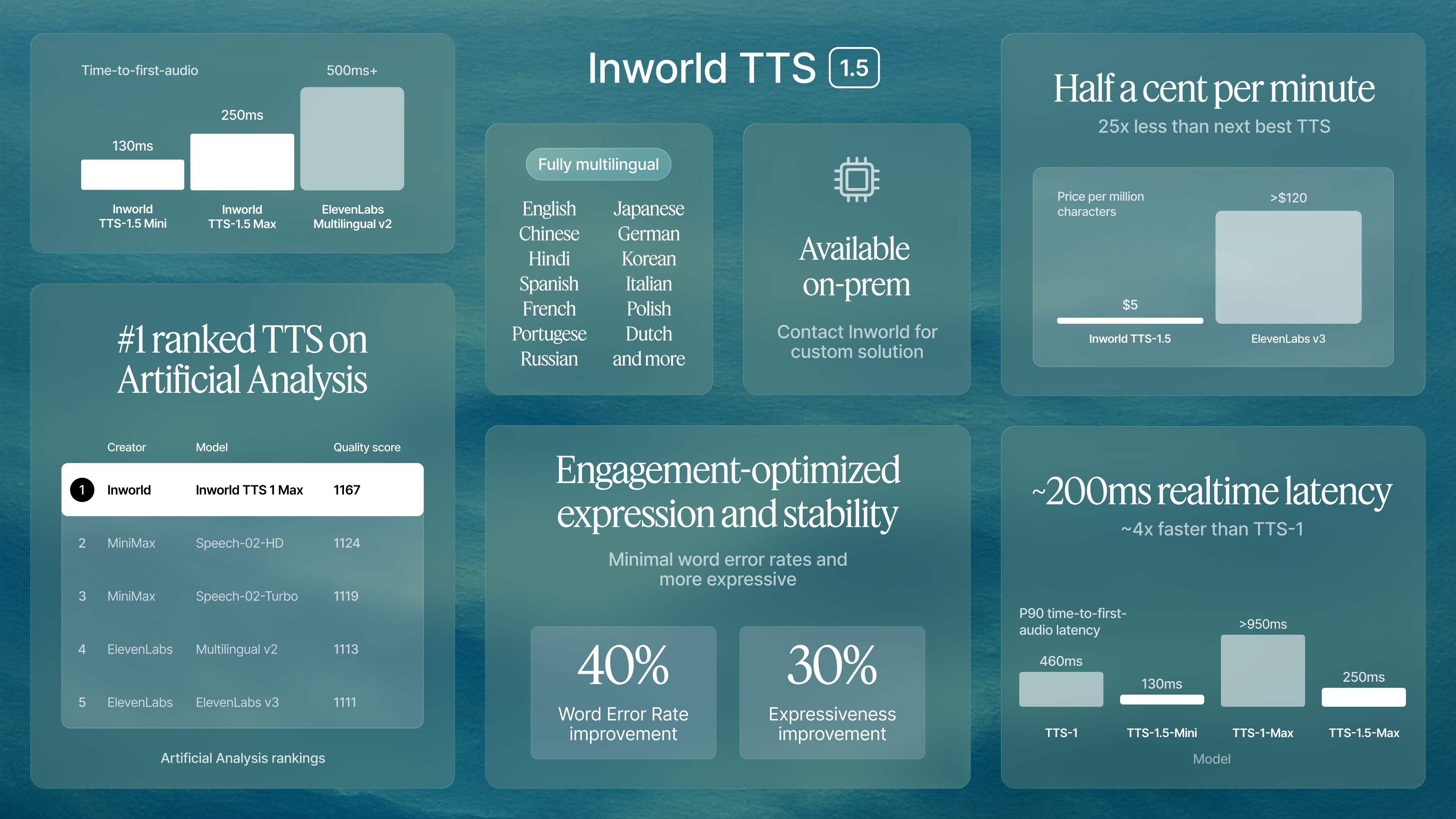- Google Cloud Text-to-Speech provides enterprise-grade solutions at \$16 per million characters with extensive language support, but operates as a closed system without the open-source flexibility and transparency that Inworld TTS offers.