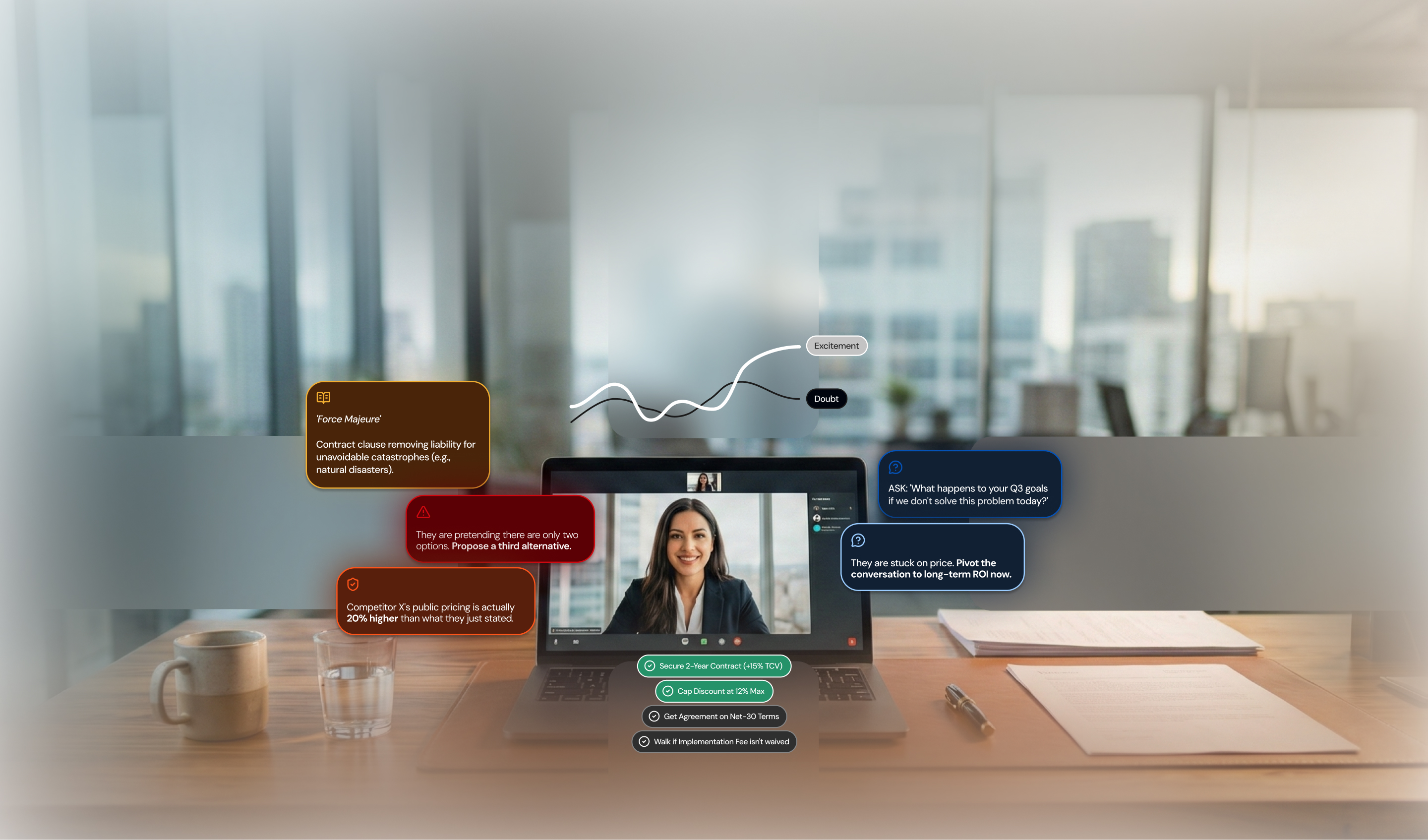 Legal and Contract Discussions: Complex legal language, ambiguous terms, and carefully worded provisions can obscure unfavorable conditions. Real-time analysis helps identify vague language requiring clarification, spots potential loopholes or problematic clauses, and prompts questions that force explicit commitment on critical terms.