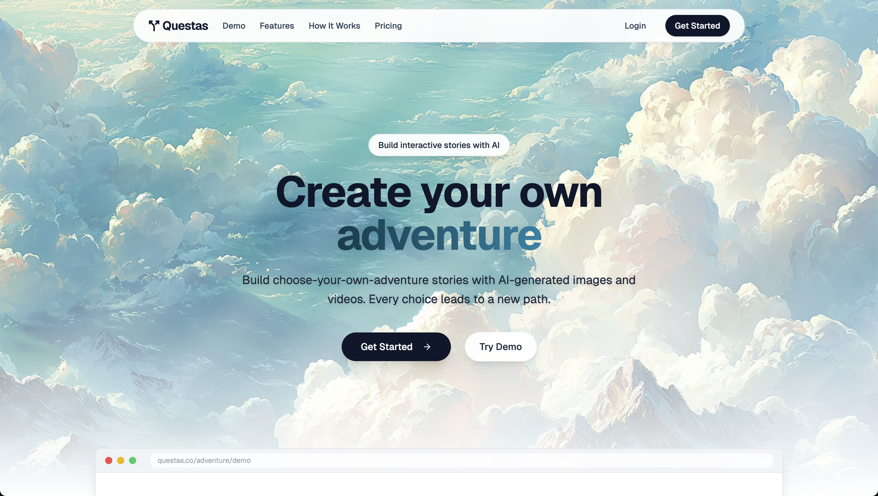Questas is an innovative web-based platform that empowers creators to build choose-your-own-adventure stories enhanced with AI-generated images and videos. The service positions itself at the intersection of interactive fiction, visual storytelling, and artificial intelligence, enabling users to craft branching narratives where every reader decision leads to a unique path through the story.