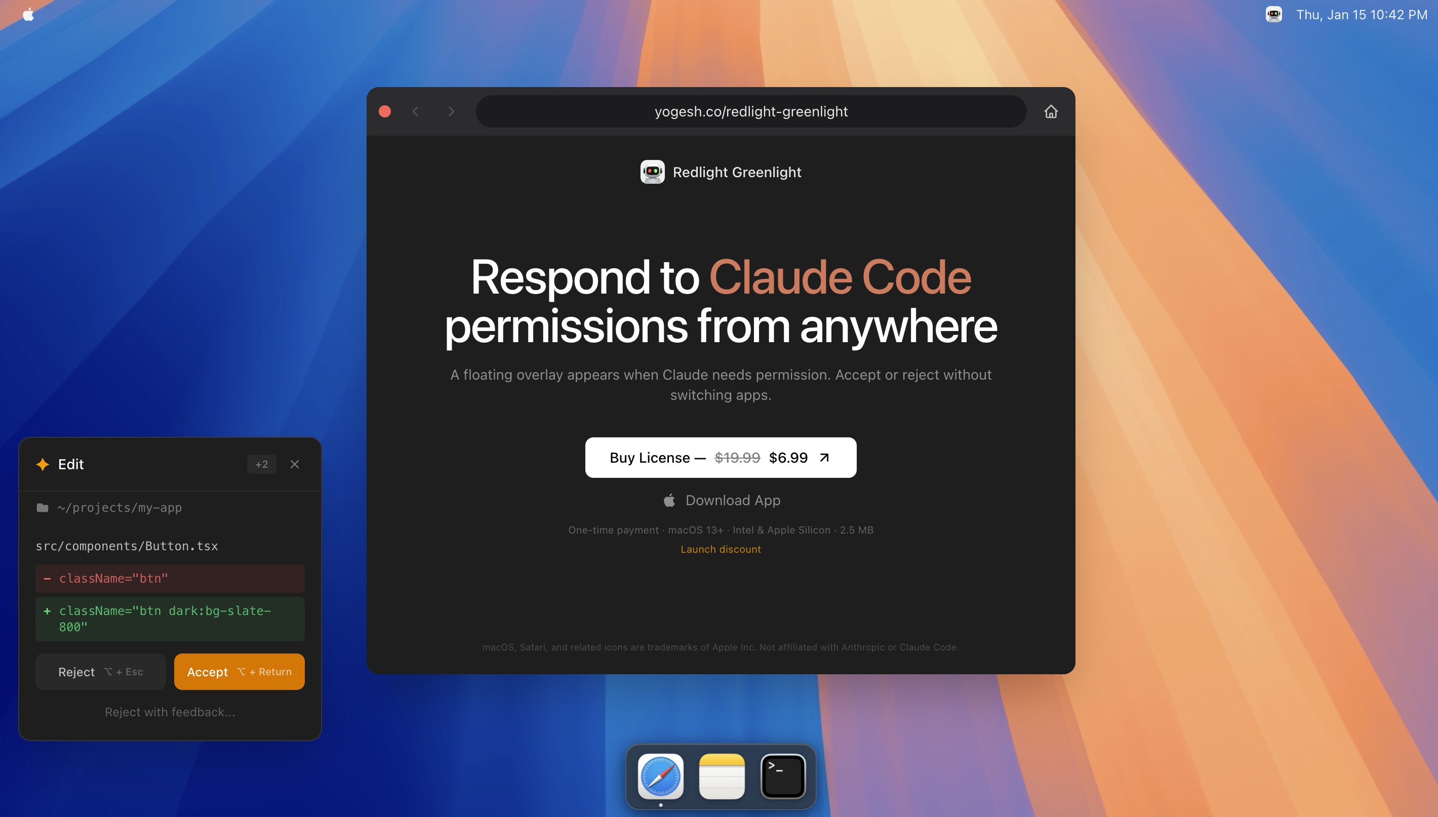 Redlight Greenlight is a specialized macOS productivity utility designed for developers who frequently use the Claude Code command-line interface (CLI). It addresses a specific friction point in AI-assisted development: the constant need to switch back to the terminal to manually approve or deny file edits and command executions. By intercepting these permission prompts and surfacing them in a global GUI overlay, the app allows users to maintain their focus within their primary IDE or browser, effectively reducing “terminal fatigue” and context-switching overhead.