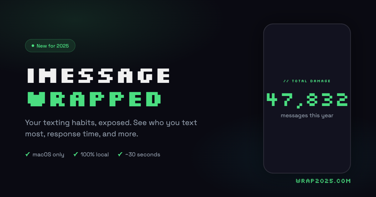 Your 2025 texting habits, exposed. See your most texted contacts, response time, personality type, and more. Works with iMessage and WhatsApp. 100% local, runs in 30 seconds on your Mac.